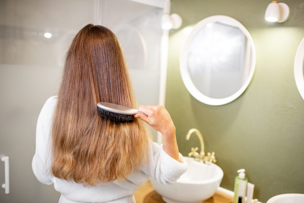 Ne sautez pas dans la douche sans brosser vos cheveux en amont, cela permettra de les démêler et de les préparer au shampoing.